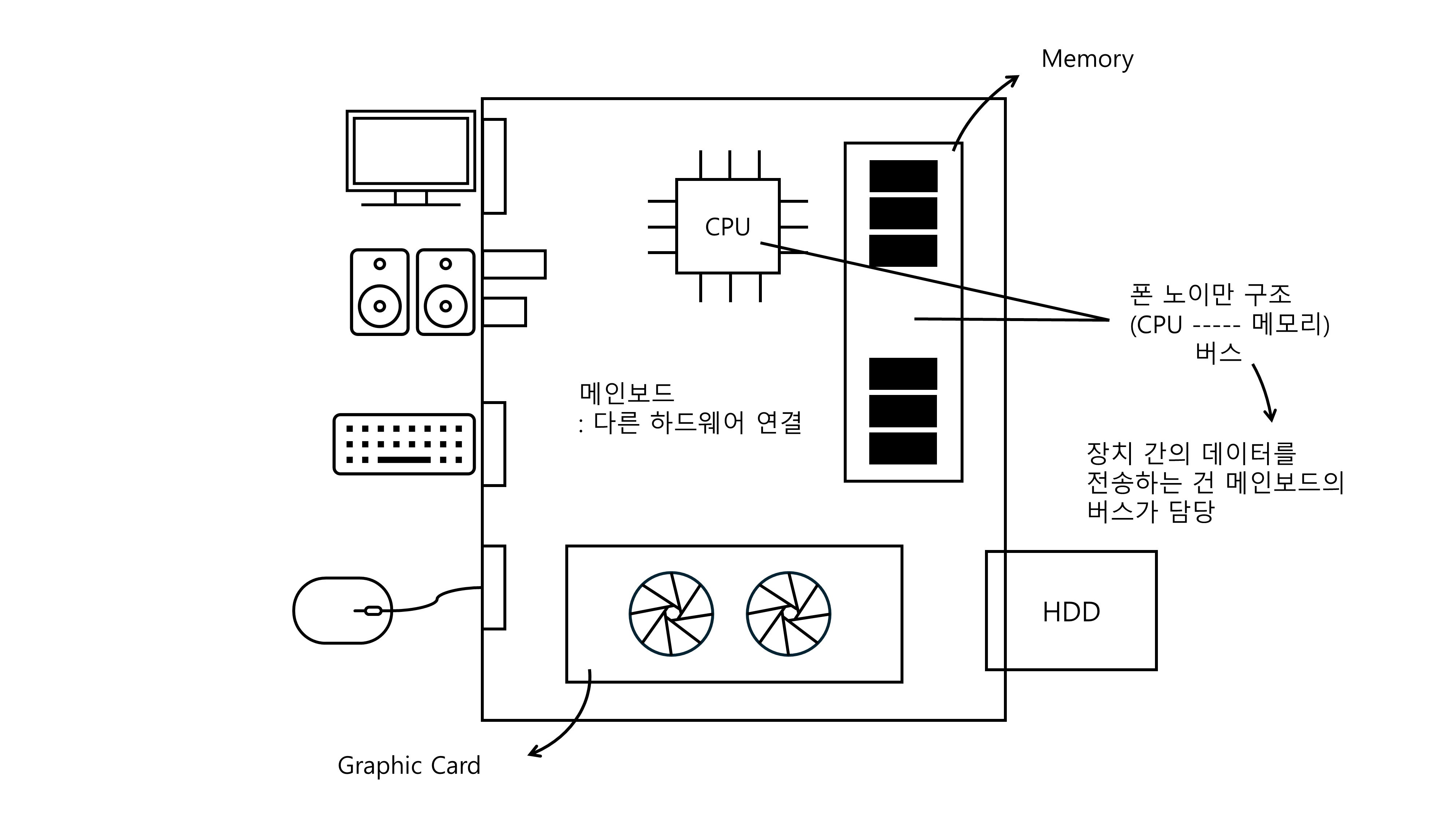 - CPU, 메모리, 저장장치, 그래픽카드 등이 메인보드에 연결됨
