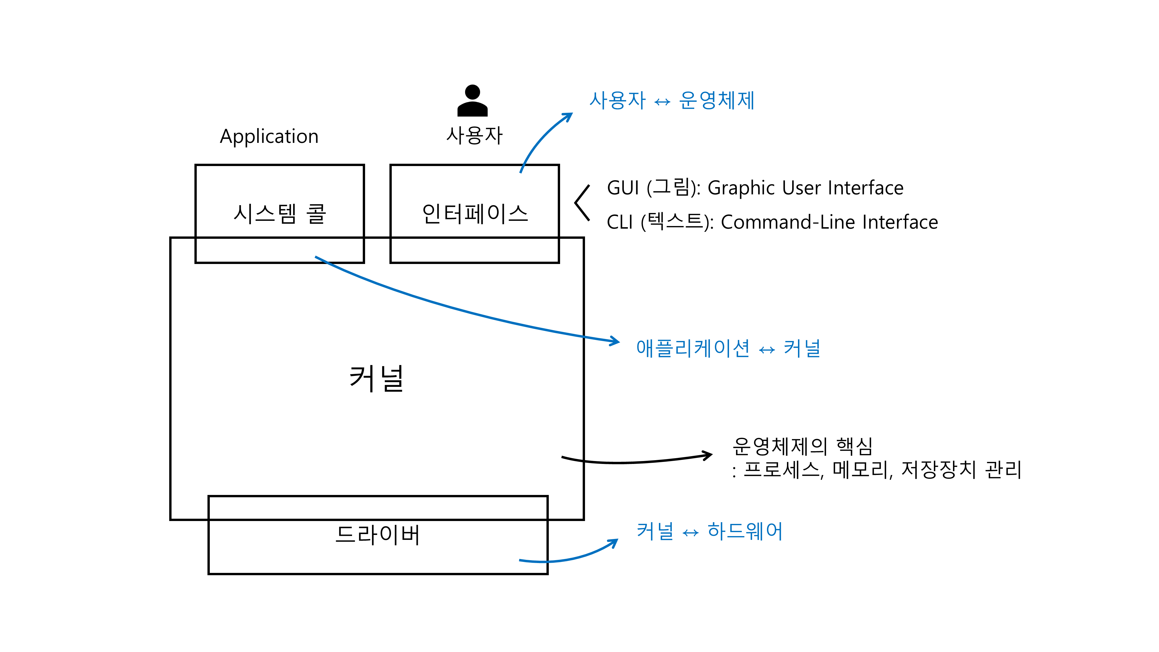 - 커널 ↔ 하드웨어: 드라이버